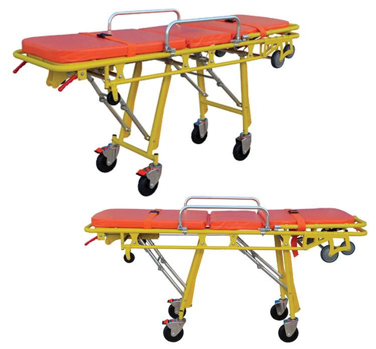 擔(dān)架主體采用鋼制結(jié)構(gòu)。采用海綿軟墊,使傷病員躺臥舒適。折腿機(jī)械結(jié)構(gòu),通過(guò)左右手柄控制,僅需一名救護(hù)人員把病人推上救護(hù)車。