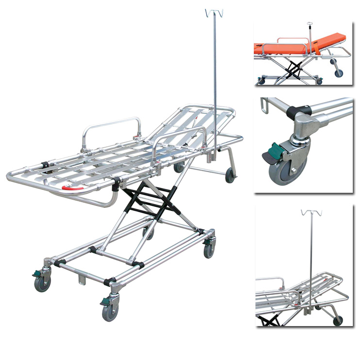 擔架高度可隨意調節(jié),調節(jié)高度時按動手柄。僅需二名救護人員把病人推上救護車。采用防滲水海綿軟墊,背靠角度和腿部可調節(jié),使傷病員躺臥舒適。本擔架配有保險鎖,運送病人時必須鎖止。
